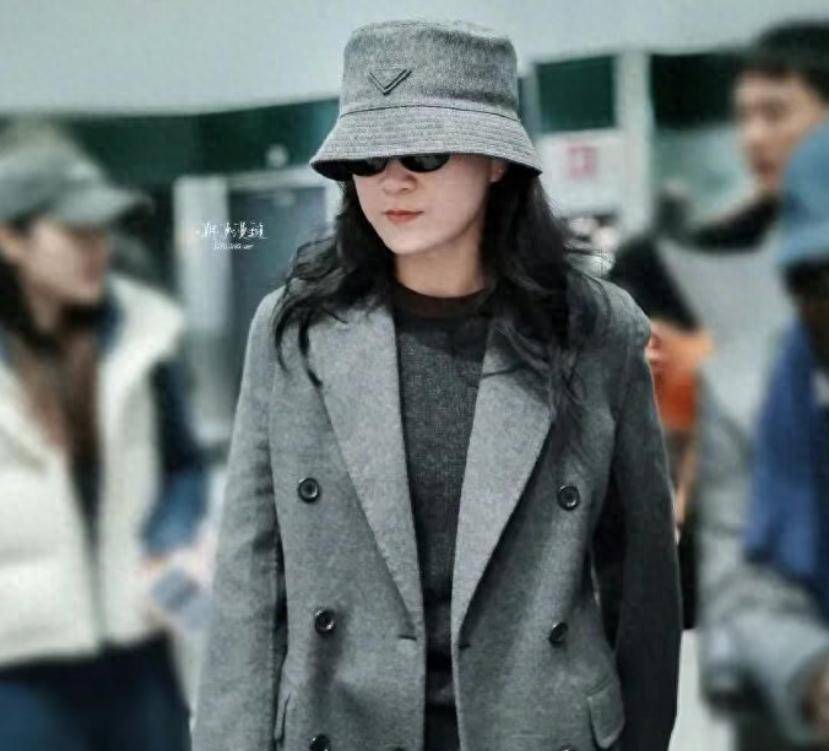只见她身穿灰色大衣搭配牛仔裤,搭配了一顶同色系渔夫帽,帽子底下是长发和墨镜。