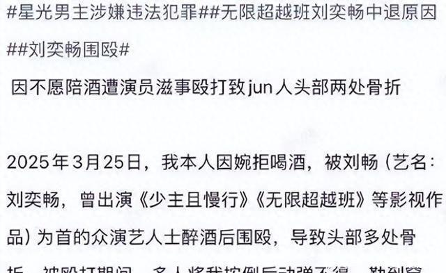 真正让他决定曝光的,月中旬看到刘奕畅主演的网剧《星光》正常开播,施暴者仍在荧幕上受追捧。 爆料一出瞬间引爆网络,随着更多证据曝光,涉案人员名单逐渐清晰,并非刘奕畅一人单独施暴。